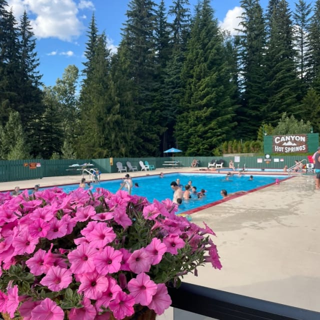 Canyon Hot Springs Resort, located 35 km east of Revelstoke, British Columbia, offers a serene retreat amid the Selkirk Mountains. The resort features two mineral pools: a 40°C (104°F) hot pool and a 32°C (86°F) swimming pool, providing a soothing experience for visitors. Accommodations include rustic log cabins and nearly 100 campsites, catering to various preferences.