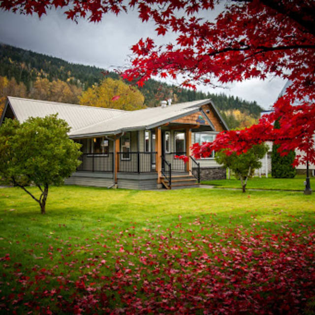 Fall Line Guesthouse is an upscale vacation rental in downtown Revelstoke. This spacious four-bedroom, two-bathroom property offers modern amenities, including a hot tub and outdoor firepit. Guests can easily walk to nearby eateries and entertainment venues. The guesthouse provides a fully equipped kitchen, comfortable living areas, and free Wi-Fi. Specials may include discounted rates for extended stays or seasonal offers.