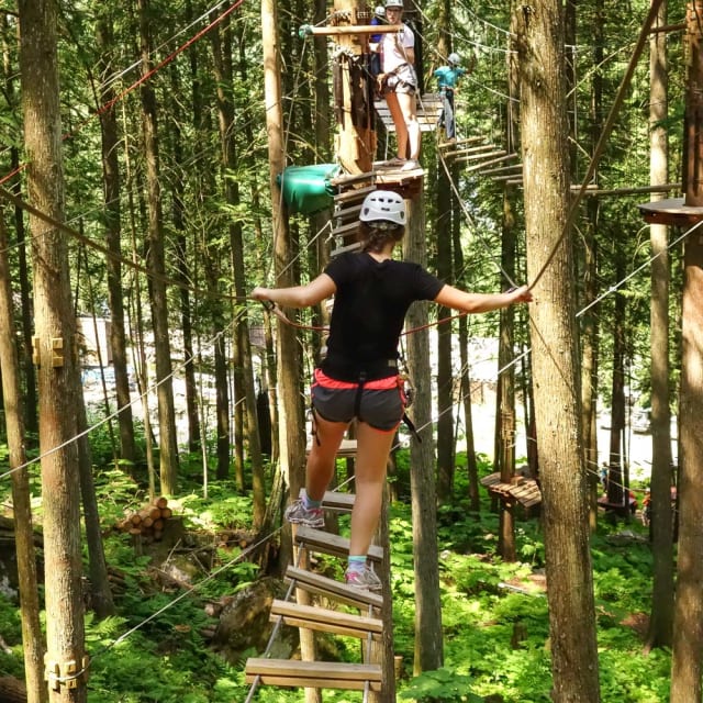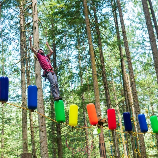 SkyTrek Adventure Park, located near Revelstoke, BC, offers a range of outdoor activities suitable for all ages. Visitors can challenge themselves on the Sky Course, an elevated obstacle course reaching up to 40 feet high, featuring zip lines and various obstacles. For those seeking a thrilling experience, the Sky Lines provide tandem zip lines up to 170 feet long and 50 feet above the ground. The Adventure Tower presents climbing walls and the Sky Drop, a 40-foot free fall. Children can enjoy the Kids Sky Adventure, a scaled-down version of the Sky Course, and the Kids Sky Gym, an elaborate jungle gym with a zip line.