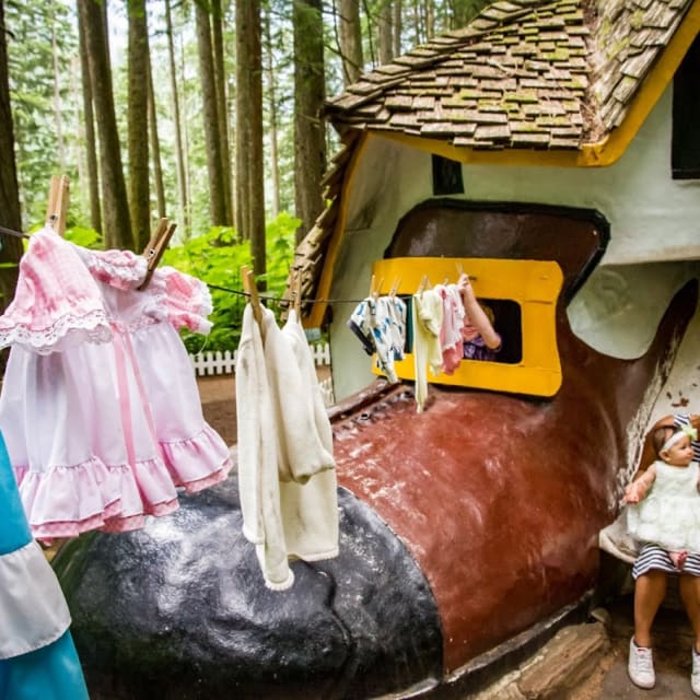 The Enchanted Forest, located between Revelstoke and Sicamous, BC, offers a whimsical experience for visitors of all ages. This attraction features over 350 handcrafted fairy tale figurines and structures, including British Columbia's tallest treehouse, a giant cedar stump house, and a castle with dungeons. Guests can also enjoy a self-guided rowboat tour through real beaver ponds and a 2-kilometre interpretive nature walk.